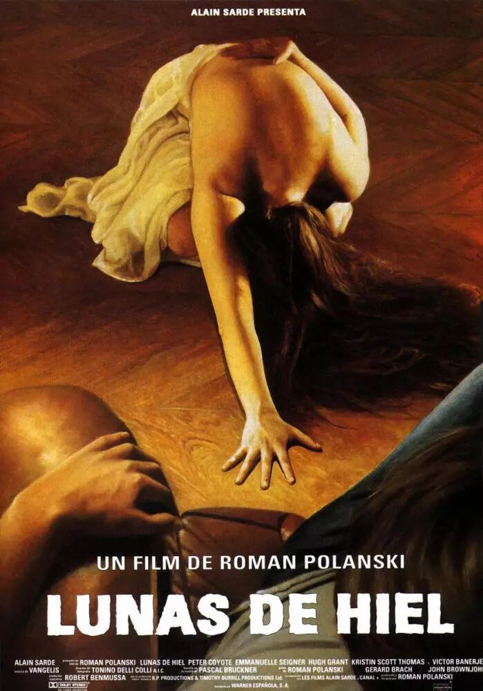《苦月亮》(1992)亮点:这是一部关于虐恋片子。艾玛纽尔?塞尼耶美艳动人,从黑皮衣里伸出的大腿是情欲的象征,也是征服与控制欲的体现。6