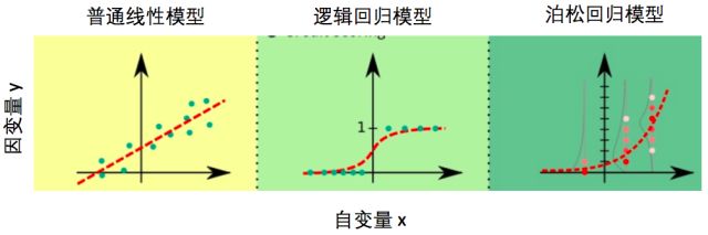 对比普通线性模型,逻辑回归模型,以及泊松回归模型,我们可以发现这几个模型除了等式左边形式不同,当因变量取特定值时,这些模型所假设的y的随机分布形式也不一样,如下图: