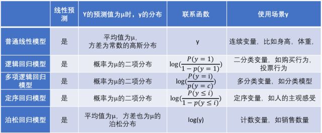 最后,我们用一张表格来总结各种不同的线性模型。在表中,我们把普通线性模型看做是广义线性模型的一个特例。