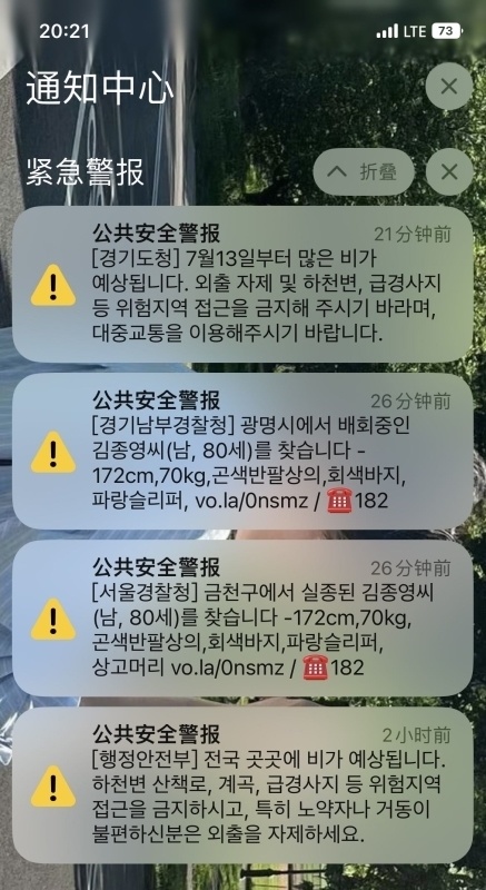 又来了! “【行政安全部】预计全国各地都会下雨。禁止靠近河岸步道、溪谷、陡坡等危险地区,特别是老年人或行动不便的人,请不要外出。”从中国赴韩国江陵参加合唱比赛的于涌回忆,自己7月8日至7月14日在韩期间,手机不间断地会收到关于暴雨的公共安全警报推送,“几乎每天都会有一两条。”