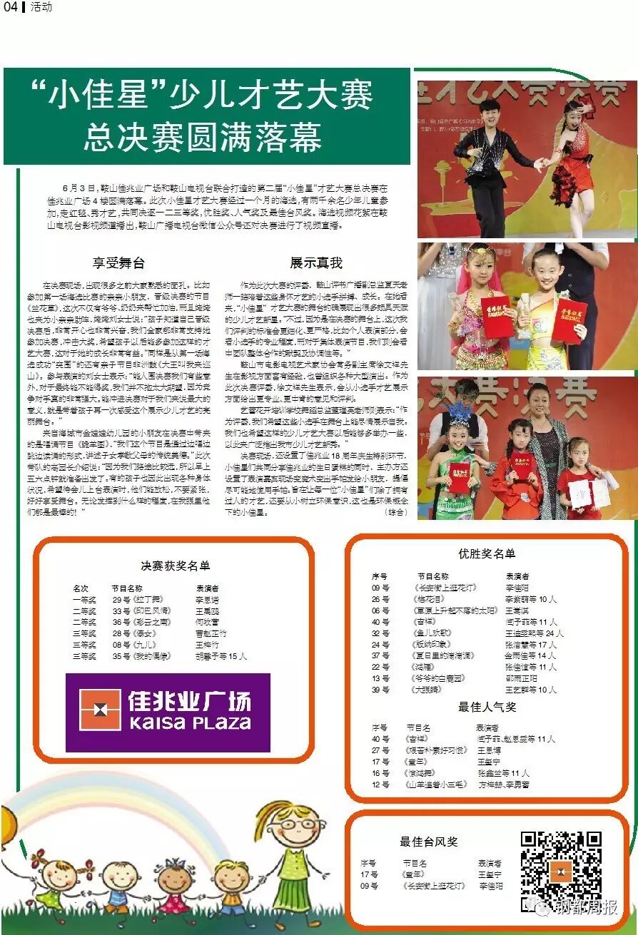 6月3日,鞍山佳兆业广场和鞍山电视台联合打造的第二届“小佳星”才艺大赛总决赛在佳兆业广场4楼圆满落幕。此次小佳星才艺大赛经过一个月的海选,有两千余名少年儿童参加,走红毯、秀才艺,共同决逐一二三等奖,优胜奖、人气奖及最佳台风奖。海选视频花絮在鞍山电视台影视频道播出,鞍山广播电视台微信公众号还对决赛进行了视频直播。