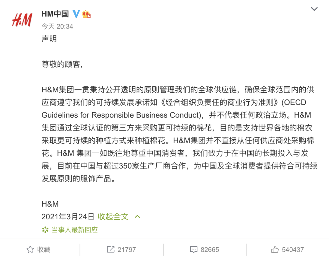 3月24日,@HM中国 发布声明称,H&M集团并不直接从任何供应商处采购棉花。H&M 集团目前在中国与超过350家生产厂商合作,为中国及全球消费者提供符合可持续发展原则的服饰产品↓