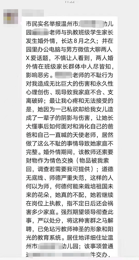 据网络上流传的消息显示,该幼师为温州龙湾一公办幼儿园教师,期间与一位学生父亲发生婚外情,关系长达8月之久