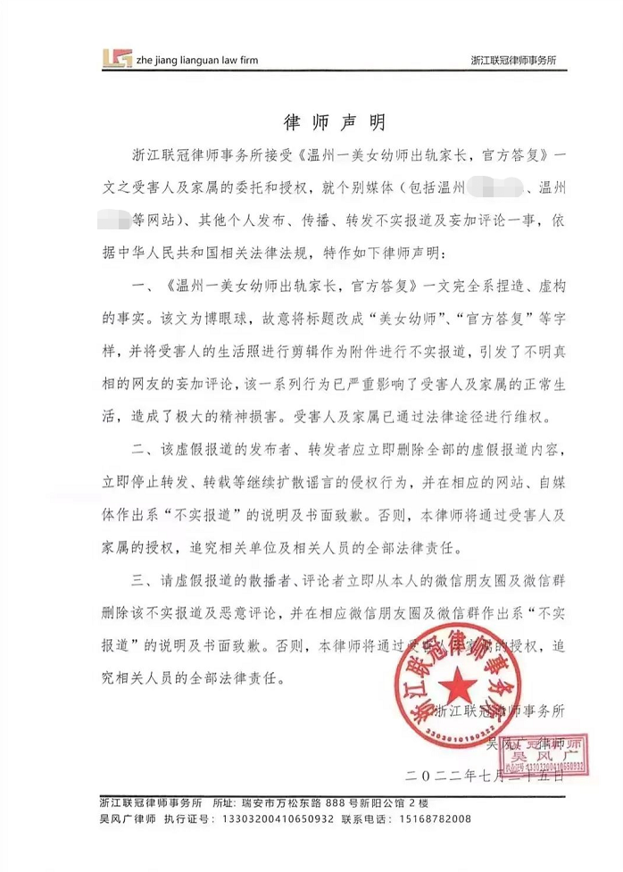 手机访问:wap.265xx.com温州一女幼师出轨家长?律师函来了