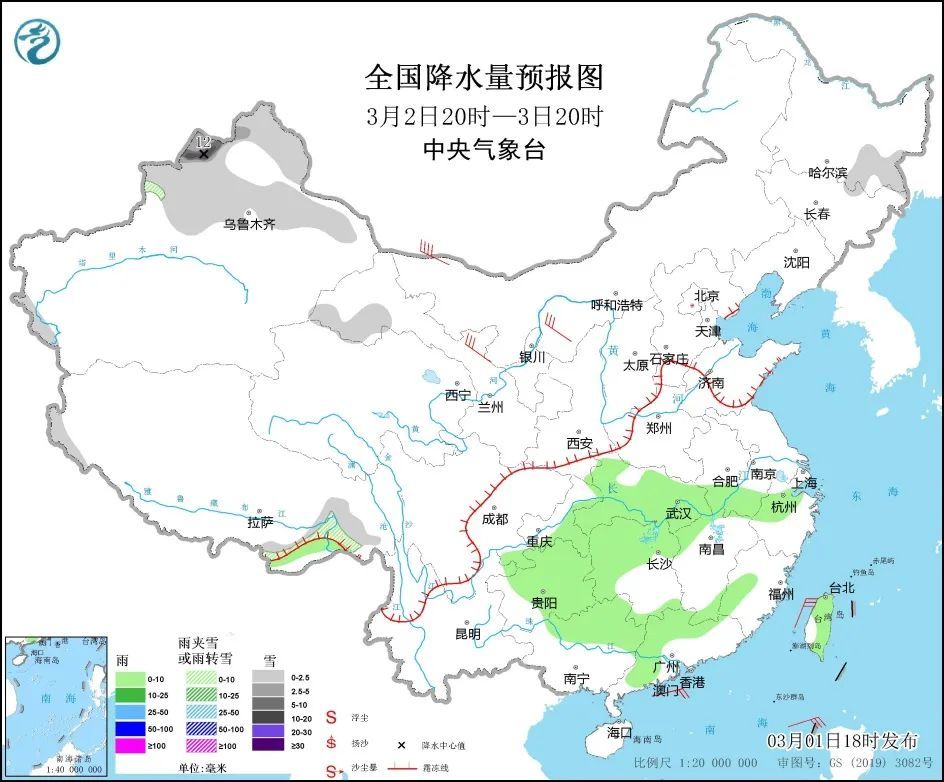 3月2日,内蒙古东北部、黑龙江南部、吉林东部、新疆沿天山地区和南疆盆地、西藏南部、青海西部和南部、甘肃河西等地部分地区有小到中雪或雨夹雪,其中,黑龙江东南部、吉林东部等地部分地区有大雪(5~7毫米)。西藏东南部、安徽南部、湖北东部、浙江大部、福建大部、贵州大部、云南东南部、广西北部、广东北部、海南岛、台湾岛等地部分地区有小雨。