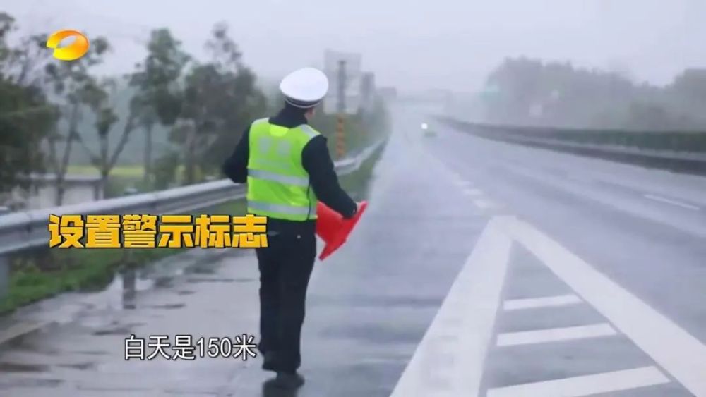 驾驶人在确保安全的情况下在车后150米处安放三角警示牌,弯道或者视线不好的地方应放在入弯处。摆放警示标志时,要注意避让过往车辆,注意自身安全。如果遇到大风天气,还要使用重物压住三脚架,避免被风吹倒。