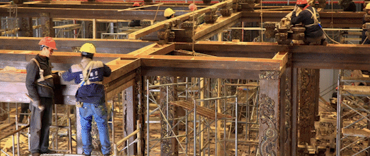 龙德殿场景搭建历时四个半月,峰值时有大约200个泥雕、木雕和石雕师傅同时进场。面对小的只有几公分,大的几米的各种构件,场景美术指导邱生采用了科学高效的工作模式:“我做了一套塑形列表,详细到你有任何的关于构件关于雕刻的疑问,纹饰、材质、个数、效果,你都可以在这个表里面去找到答案。”