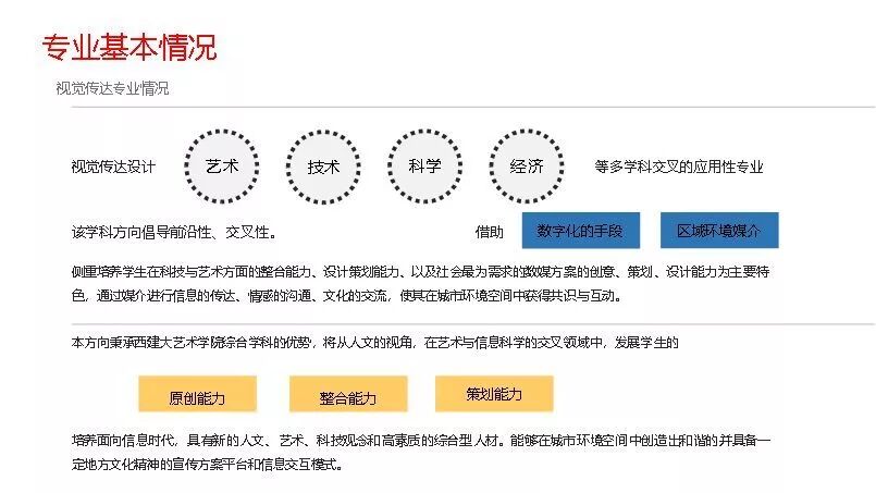 视觉传达设计专业注重培养学生独立获取视觉传达专业的理论和实践知识、更新知识和应用知识的能力,良好的表达能力和计算机应用能力;能将所学的知识灵活地综合应用于科学研究或工程实践,具有独立分析、解决实际问题的能力;有创新意识,对本学科领域的国内外研究现状、发展前景有一定了解,具备一定的创新性思维和探索能力。