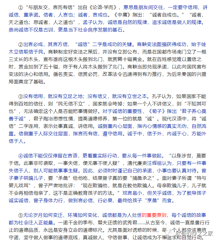 16.先提出自己的观点“诚信不能仅仅停留在言语,更看重实际行动,要从每一件事做起”,接着引用古人的话进行道理论证,最后以曾子“杀彘”的故事从正面论证自己的观点。