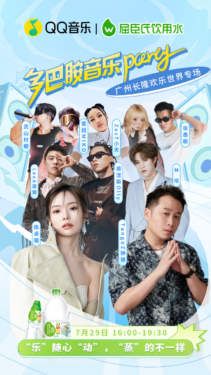 7月18日,由QQ音乐和屈臣氏蒸馏水联合举办的多巴胺音乐party正式官宣。7月29日在广州长隆,陈卓璇、LEeA梁傲 、姬涅斯Olly、林陌、灵山村帮LingShanGang、MIko蜜妞、TangoZ、柘小天、张愚歌将带来精彩演出,共创美好记忆!另外,北京、上海还有更多场party待官宣。