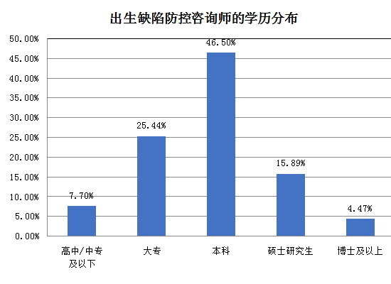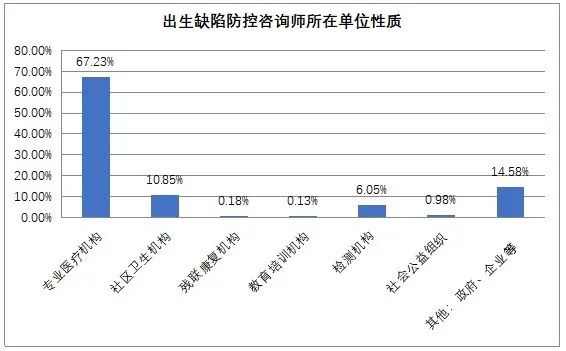 从单位性质来看,专业医疗机构中的出生缺陷防控咨询师最多,占比67.23%。其他分别为:10.85%在社区卫生机构,14.58%政府机关、企业,6.05%在检测机构,1.29%在残联康复机构、教育机构、社会公益组织。由此可见,出生缺陷防控咨询师的从业范围并不只局限于专业医疗机构,而且分布在与出生缺陷防控相关各行各业,就业面广。