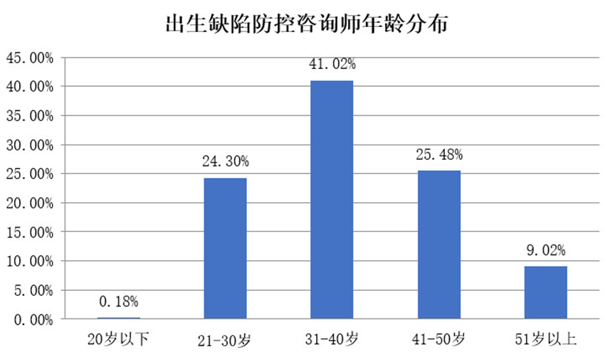 数据表明,41.02%的出生缺陷防控咨询师年龄集中在31-40岁,在问卷提交者中占比最高。其他年龄段占比分别为:20岁以下占比0.18%,21-30岁占比24.30%,41-50岁占比25.48%,51岁及以上占比9.02%。这一新职业不仅为从业人员提供了新的职业选择,也为有经验的从业人员提供了新的发展方向和晋升空间。