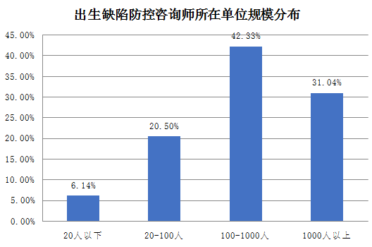 出生缺陷防控咨询师在各个规模单位中均有分布,中型大型单位占主流。42.33%的出生缺陷防控咨询师在100-1000人的中型单位,31.04%的在1000人以上的大型单位,20.50%的在20-100人的小型单位,6.14%的在20人以下的微型单位。