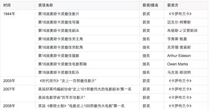 《卡萨布兰卡》从二战时期上映以来陆续获得多项大奖,并在2007年力压《教父》,《肖克申的救赎》等经典影片,获得美国好莱坞编剧协会评定的“史上101部最伟大的电影剧本”第一名。
