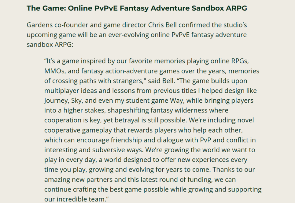 Gardens总裁兼创意总监Chris Bell称,本轮融资资金将用于雇佣顶尖游戏人才,扩充团队以更好地打造公司首款在线PvPvE奇幻冒险沙盒ARPG游戏。