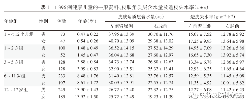 表皮通透屏障功能指皮肤防止物质通过表皮进出机体。表皮通透屏障主要位于角质层,由分化蛋白和角质形成细胞间的脂质混合物构成[1]。角质层的含水量主要由角质层天然保湿因子的量决定,主要保湿因子包括氨基酸及其衍生物、甘油、透明质酸、盐、乳酸和脂质等[2]。表皮通透屏障功能和角质层含水量由角质形成细胞的生物功能决定,而角质形成细胞的功能受诸多体内外因素的调节[3-5]。临床上,通常通过测量透皮失水率和电容(或电阻)分别衡量表皮通透屏障功能和角质层含水量。特应性皮炎和银屑病皮损中角质层含水量与透皮失水率呈负相关[6]。因此,有学者认为,皮肤干燥是表皮通透屏障功能受损的表现。但我们前期对1 404例健康成人的研究结果显示,角质层含水量与透皮失水率呈正相关[2],提示皮肤干燥似乎不是表皮通透屏障功能受损的表现。由于年龄可以影响角质层含水量和透皮失水率[7-8],我们研究1个月至17岁健康儿童皮肤角质层含水量与透皮失水率的相关性。