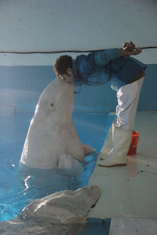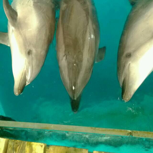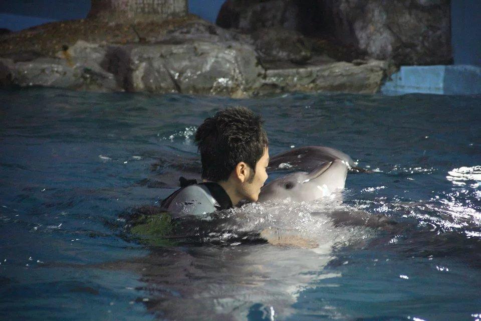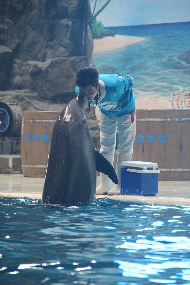 关于海豚的智商,曾经带的那只海豚就是一个很好的列子。记得第一次上台表演,带它,当时我那个傻白甜啊,看师兄们平常带它表演,它的表现很听话很稳定嘛,师兄们也都向我表明这只是三只海豚里面最听话的,最稳定的,你第一次上台,它准不会给你掉链子。我信以为真,提着鱼桶就上去了,一上去这家伙到也上道,见到我提着鱼桶往池边一站它表现的异常兴奋,我心里那个开心啊,心想小子不错,看来我这首秀是要成了啊。来,给你一把鱼,奖励奖励,好好表现。随着主持人的讲解推进,我们迎来了第一个动作,让三只海豚站立起来,亲吻我们的脸颊。一上来就是这么有爱的行为,哈哈,我好开森啊,小家伙,来来来,亲一个嘛,来....诶,你瞅啥呢,来来,站起来,亲一个。旁边两只海豚整齐划一的从水里站起来各自完成了亲吻动作,而我这只.... 这家伙静静地呆在水里,一脸懵逼的看着我,纹丝儿不动。