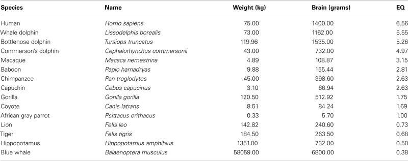 如果单纯看大脑重量和身体重量的重量比(brain-to-body mass ratio),人类(1/40)和小鼠(1/40)近似,且小于一部分小体积的鸟类(1/12)。地球上该重量比最高的生物是鼩鼱科(Shrew)