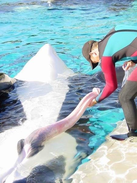 平常工作除表演以外,还有一项比较重要的任务就是陪它们玩儿,它们非常喜欢有人陪它们玩,极其喜欢,我们经常会为了挑逗下它们,会故意站在岸边,站很久,这时它们就开始如上图那样由刚开始的兴奋、期待,到疑惑的侧眼打量我们,然后我们突然纵身一跃,跳进池子,它们立刻就会像打鸡血一样,高兴的龇牙咧嘴(是真龇牙咧嘴),在池子里蹿来蹿去,然后就一窝围过来,三只家伙开始轮流凑近我们,用脑袋蹭,用背拱(小孩子撒娇耍无赖时基本也是这样)。