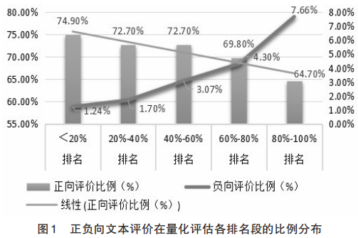 分别计算正向和负向评价在量化评教各分数段所占比例,比对结果显示,量化评教成绩排名越靠前的课程,学生的正向文本评价比例越高;量化评教成绩排名越靠后的课程,学生的负向文本评价数比例越高,(见图1)说明学生主观评教文本的评价倾向分布与客观评教成绩的排名位次高度一致,两者可以在学生评教结果分析过程中互为补充、互为印证。