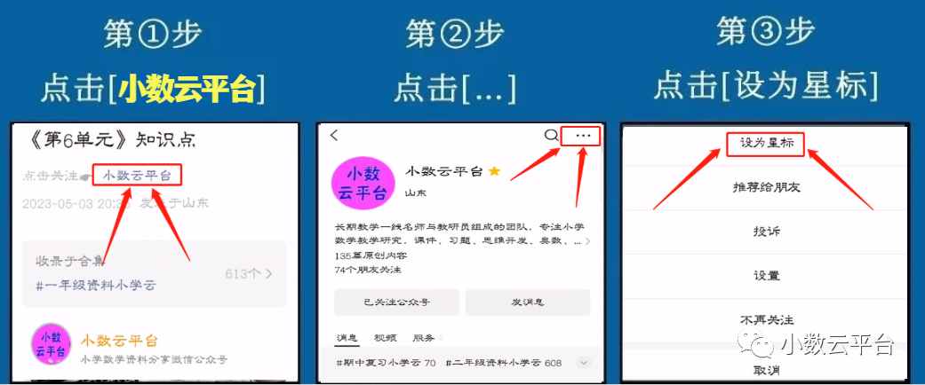 小学数学资料分享微信公众号于茫茫学海中,为你寻找更适合自己成长的有效资源和那些锲入心灵的文字。与高人交心,轻松学习,把时间留给更重要的人更重要的事。亲爱的读者,微信公众号又改版了,如果没有星标,公号文章就会渐渐沉底,我们可能长久失联。给小数云平台一个星标,让我们茫茫人海,永不失散。方法如下