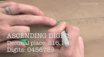 这个数字出现在小数点后第216176位,是第一次出现的连续7个数字(把0看成9的后继的话)。很可惜我们还没有找到0123456789。