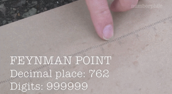999999又叫“费曼点”,位于圆周率小数点后第762位,来源于物理学家费曼。相传由此费曼在上课的时候开了个玩笑,“希望我能把π记到那一个点,那么背诵到最后时,我就可以说后面是999999等等”。不过费曼本人并不记得他讲过这个笑话。