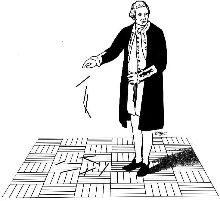 18世纪数学家布丰设计了一个非常有意思的计算圆周率π的实验。布丰在地板上画出若干平行的直线,再将一根根短于平行直线距离的针撒到地板上,通过统计针的总数和与直线相交的针的个数,计算圆周率。
