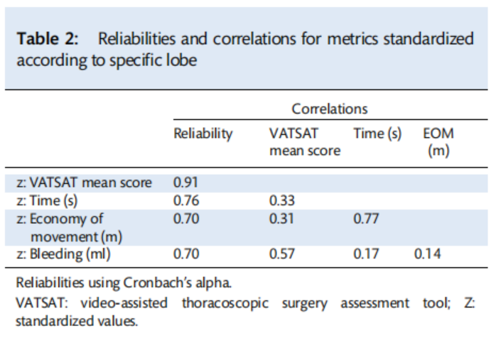 在所有4种评估方法中,数据表明,经验是成功的VATS的重要贡献因素。有经验的VATS外科医生在所有尝试中都表现得更好。这并不令人惊讶,因为有经验的VATS外科医生在处理组织时很熟练,因此出血更少,操作更少,手术速度更快。