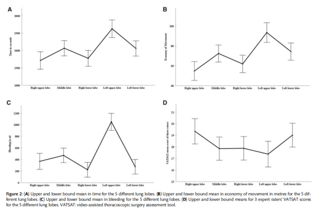 VR VATS肺叶切除术模拟使胸外科医生能够练习先进的手术技术,并得到每个手术的客观自动反馈,这可能会缩短临床学习曲线[3,8-11]。VR模拟器生成的指标包括各种标准化参数,如手术时间、出血量和运动经济性[12-14]。在之前的研究中,我们为VR模拟器测试所有5个肺叶提供了有效性证据[3]。三个模拟器指标显示了初学者和有经验的外科医生之间的显著差异,并建立了每个指标的个人通过/不通过水平。与有经验的外科医生相比,实习生出血量更多,手术时间更长,使用的动作更多[3]。然而,这些测量的可靠性很低,可能是由于不同肺叶之间的解剖差异。这些解剖学上的差异可能会影响手术的难度、并发症发病率和术后结果[15],VATS专家对哪个肺叶手术难度最高存在争议。