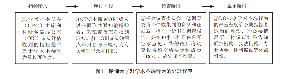 美国各高校处理学术不端的程序基本相似,一般分为四个阶段(以哈佛大学为例,见图1)。一是指控阶段。学校所有人都有责任向职业操守委员会(Committee on Professional Conduct, CPC)主席或科研诚信办公室(O?ce of Research Integrity, ORI) 成员报告发现的学术不端行为,CPC主席和ORI成员收到指控后立即评估其是否属于学术不端行为以及指控的可信度,评估期应尽量短,与指控审查有关的记录由ORI成员保留7年。二是质询阶段。CPC主席或ORI成员以书面形式告知被指控者。三是调查阶段。任命调查委员会,由具备专业素质的人来审查相关材料和证据,约谈涉事人员,与被指控者存在任何专业或利益冲突的人员应回避,被指控者有权在收到书面通知后的五日内对调查人员名单提出异议。调查后形成一份书面调查报告,内容包括被告信息、学术不端行为描述、研究资金情况、调查的事实依据、被指控者对报告的意见,总法律顾问办公室就此提出专业建议。征求意见并修改后将最终调查报告递交给决定组成员(Deciding Official, DO),确定调查结果。四是裁定阶段。DO遵守“零容忍”原则,根据不端行为的严重程度给予适当的惩治。整个过程遵守保密原则,调查人员只能把被指控者和举报人的身份信息披露给有必要知道的人,避免损害被指控者的权利和名誉,同时也要保护举报人、证人、调查人员免遭报复。[29]