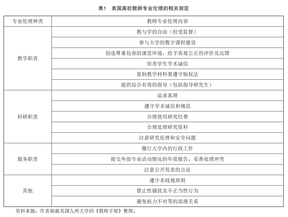 党的十八大报告首次将“立德树人”确立为教育的根本任务,党的十九大报告进一步指出“要落实立德树人根本任务”。关于加强师德师风建设、落实立德树人职责的政策文件和相关研究在2014年之后迅速增多。落实立德树人要求,关键在于加强教师队伍建设,原则之一是“突出师德”, “把提高教师思想政治素质和职业道德水平摆在首要位置”。[1]大体上对所有教师而言,师德是指其职业道德,是教师在从事教育活动中必须遵守的道德规范和行为准则,以及价值观层面的思想政治水平、道德观念和道德品质等。但对大学教师而言, 其职责从教学拓展到研究,研究活动需要遵守学术道德;对研究生导师而言,其职责又从教学、研究拓展到指导研究生,在指导研究生的过程中综合教学、科研、服务、培育人才等多项职责,师德的内涵更为复杂化了。为解决师德失范、学术不端等问题,健全高校师德评价制度、发挥制度规范约束作用已成为共识,但师德的考核评价成为推进中公认的难点。这可能是因为“师德”的概念停留在“弘扬高尚师德”的层面已久,形成了一种因抽象带来的飘浮感,在人才培养各环节对师德的要求不够具体,处理程序不够规范,评价较难落到实处,影响了师德建设效果的达成。美国高校从“专业伦理” 的角度理解教师角色及处理不端行为的相应做法, 体现出明确性、规范性、专业性的特点。通过与美国高校教师专业伦理进行比较研究,不仅有利于借鉴美国的经验健全我国高校教师立德树人职责的落实机制,还有助于更好地理解和传承中国优秀的“师道”传统。