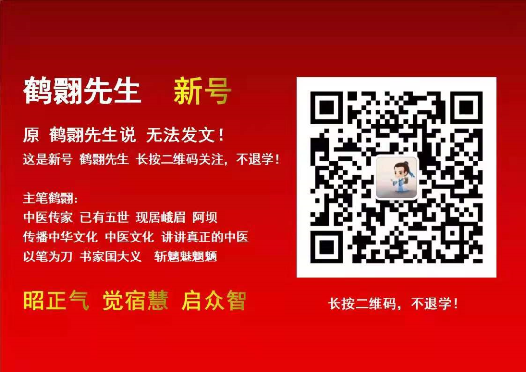 鹤翾先生ID:gh_5c9f28b78f0e简介:聚集数十万中医药爱好者! 原《鹤翾先生说》无法发文!这是新号《鹤翾先生》,老读者长按二维码关注,不退学!主笔鹤翾:传统医学师承,中医传家,现居峨眉,阿坝。公众号介绍真中医中药、讲讲真正的中医、视角公正,去伪存真,让大家不再相信那些西方“伪科学”。以笔为刀,书家国大义,斩魑魅魍魉。欢迎关注!