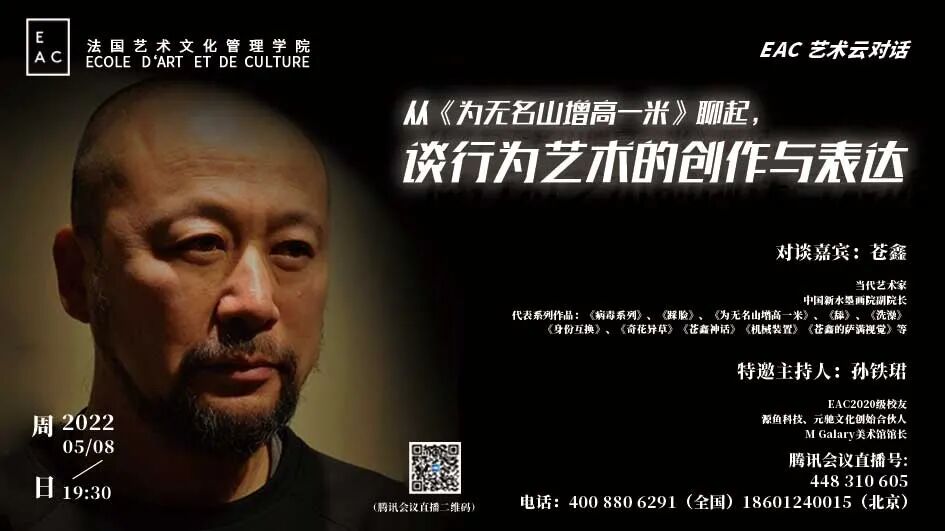 EAC艺术云对话首期,由特邀主持人EAC2020校友铁珺对话著名行为艺术家苍鑫,从为无名山增高一米聊起,谈行为艺术的创作与表达。