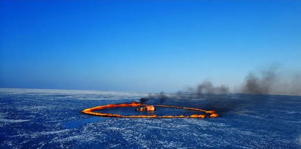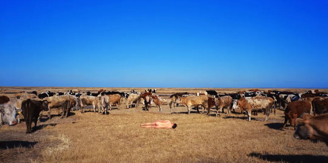 天人合一系列-火圈 photo 2003 126x166cm 铁 珺 :画面最壮观的《天人合一》系列体现人与自然的关系,天人合一,其中雪山、火圈、牛群等等有什么故事和创作理念。 苍 鑫 :因为我是一直生活在城市里,一到大庆看到恢弘、壮丽、一望无际的自然环境,冲动感非常强,感觉到人类很渺小,像一粒灰尘。看到那个景色以后,就有一种冲动,把自己融入到自然环境中。第一个作品是2002年创作的《火圈》,在零下20多度,用汽油锯沫点的火圈儿,当时我就躺在冰冻住的湖面上。 我对东北原始的萨满包括通灵很感兴趣,我就想把自己置身到这个动物、植物、旷野,或者是非常规的自然环境里面,去感受身体和这个大自然的关系。我在牛群里,看到这些牛的眼睛是很纯洁的。如果有共振的感受,当盯着动物的眼睛,那是一种神秘感,是一丝凉意,一种颤抖,这是比较深刻的状态。