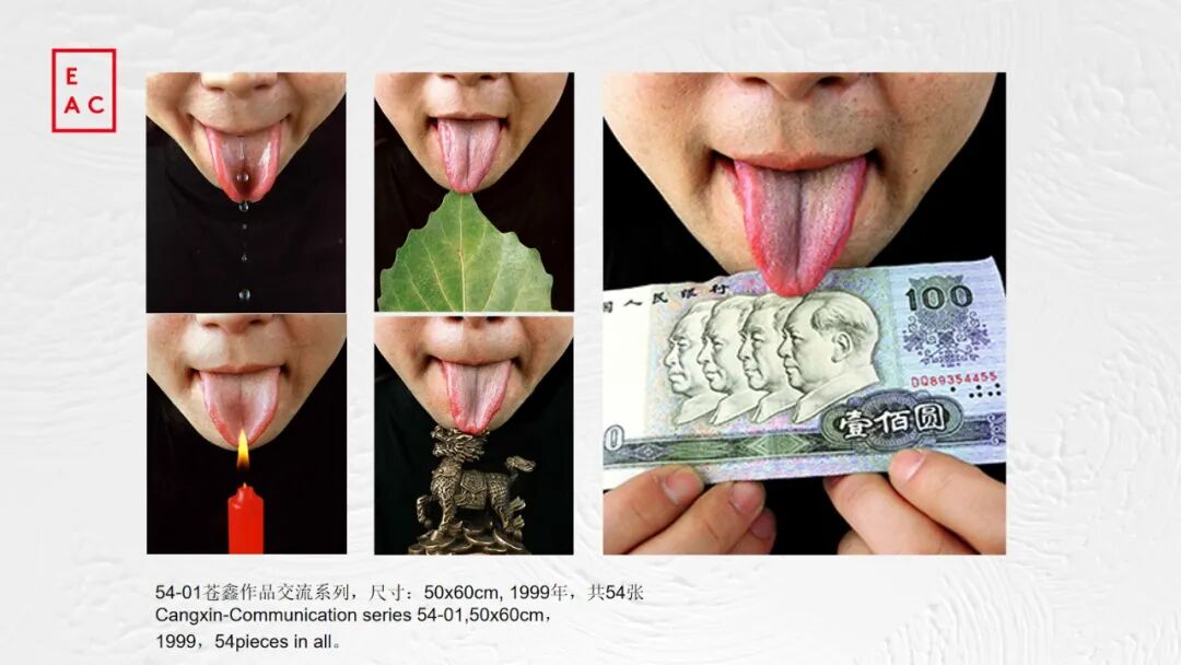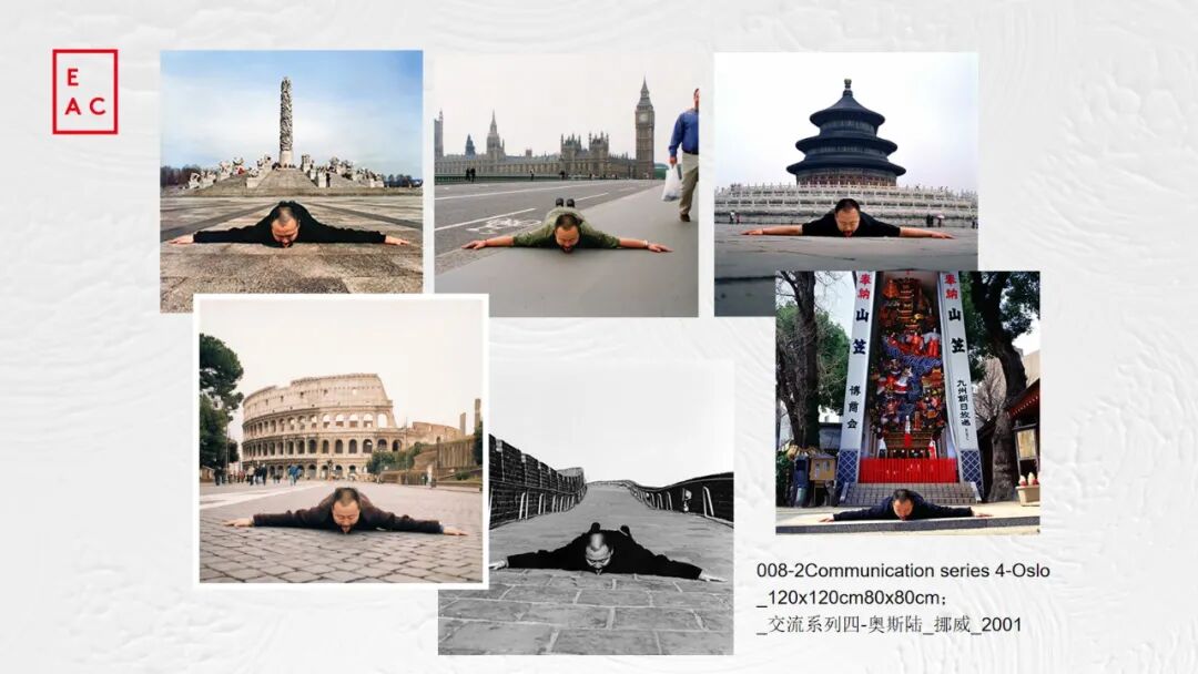 铁 珺 :《交流系列》,也就是《舔系列》这一系列总共有多少幅作品,可以谈谈当时是什么创作动机和思想? 苍 鑫 :这个系列是从1996年开始做的,到现在还在做,拍摄照片多达1000多张。这个作品是关于身心灵。因为轻微的抑郁自闭经历,有一两年的时间,我不喜欢跟别人交流,加上口吃,见到人很害羞没法表达,导致交流是有障碍的。我就发现舌头很有意思。这是一种自我疗愈的过程,就是因为不喜欢交流,基于一种本能,就拿自己的棉被,鞋,袜子,水杯诸如此类的日常的东西来舔。当时我也不知道这个东西是不是作品,是基于本能把它拍出来 。到1999年,扩大到文化概念开始舔具有中国特色的四大发明,丝绸、茶叶诸如此类的。2000年左右,我又做了舔了一个超市1000多物品,持续了四个小时。后来这系列就是到世界各地,找到世界每个城市著名的建筑物,用密宗佛教里面五体投地姿势,把两个手张开,亲吻大地,拥抱地球,然后我去舔。背后都是带有城市明显的建筑特征的地方,所以我命名为《交流》。随着《舔》的数量增多,时间的推演下会发现“舔”是人接触世界的时候第一次的感知。“舔”是人类接触有形世界、三维空间时的第一个状态。它是最直接的,这个动作和这个本身属性代表了另外的信息。这种信息好像不是用语言来表达的,它有很多这种私密的、各异的、不可言说的一种存在的状态。