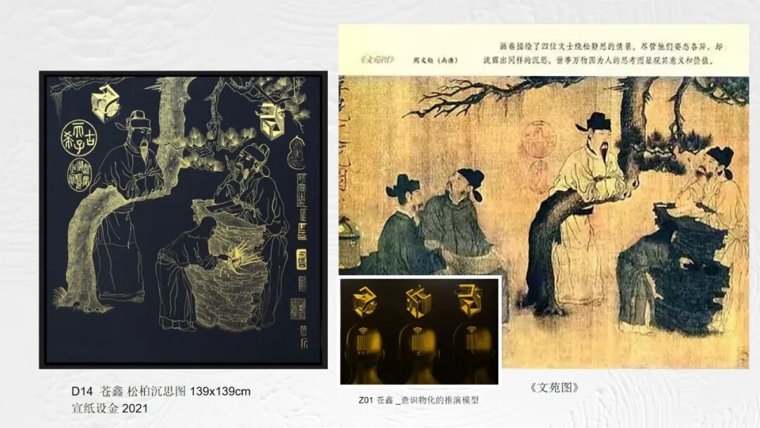 铁 珺 :《松柏沉思录》是源于南唐时期的绘画《文苑图》,您这种“黑金”手法的创作是怎么形成的?《松柏沉思录》如何跟中国五千年文明里面的艺术作品去做链接?是怎么触发了对画作的再创作? 苍 鑫 :这个作品的材料是黑颜色的宣纸,先抹一层碳粉,等干了后用金粉在上面画作。这个纸主要是在寺庙里抄经文用的,本身的属性是很神圣、神秘的。这个系列作品是基于神圣几何,多维空间跟社会、时代的变迁,人性之间的几种关系。那么这个作品展开的系列有两个,一个是关于中国古代的,包括宋徽宗的,宋代的辉煌,包括五代时期的一些绘画,中国最经典的,中国的文化达到巅峰的时候,绘画美术史上非常重要的一些画,我再创造。另外一个就是西方中世纪神圣绘画,就是圣像画,我也会再创作。 《松柏沉思录》属于中国最传统,最经典里面的文人画,我采取了局部松柏,茶道还有两个文人之间的状态。文人雅士的一种生活状态,书童在研墨,墨我给他改成神圣几何,包括树上也有两个神圣几何。在这个很多宗教比如说基督教的教堂,伊斯兰的清真寺,包括中国的寺庙里头,包括道观里面有很多这种几何体,包括建筑,台阶,数量都有天象和地理的这种关系的。现在大数据,人工智能都跟你有关系,几何体是当下的,而生活方式是古代的,这之间的对比产生穿越感,古代、当代之间的关系。 ”