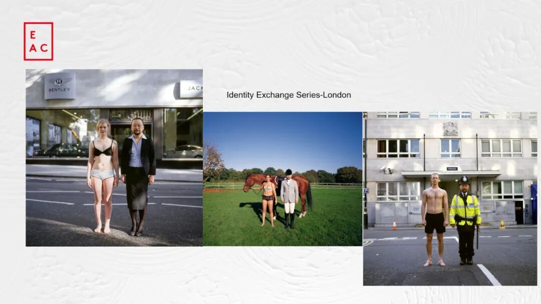 Identity Exchange Series-London 铁 珺 :《身份互换》您是想表达怎样的观点。在国内国外进行期间是否顺利,当中有没有发生一些周折,跟我们分享一些事情。 苍 鑫 :《身份互换》是有两条线索在呈现我的思考,一个就是关于社会学的,就是身份的问题,另外是关于身心灵的。艺术家是自由的,他在社会中是没有任何职业,他的职业应该是业余的,他的真正的身份是艺术家。所以我个人认为艺术家应该是抽离于这个社会才能客观地看待这个社会,艺术家什么都是,什么都不是,是一种自由和游离状态,所以我就想能不能找到不同职业的人去换衣服。另外,跟我的经历有关,我在年轻的时候就换了不同的专业学习,然后八九年进入社会以后,从事诸多职业。这些经历让我对“身份”产生了疑问和好奇,这是一个重要的冲动来源。总共用了六年时间,换了24个人,有卡拉OK小姐,北大教授,京剧演员,厨子,门童,厨师......其实不穿衣服是我,而穿衣服是他,表明其实人脱掉以后,没有任何的社会特征,社会特征是人赋予的,社会赋予的,本身的人性是没有关联。这是对身份、人性的一种提问和一种反省。在国内,这个行为是很不礼貌,在公共空间中国人接受不了暴露身体,认为身体是受之父母,是私密的不可能在公共空间呈现。所以这个周折很大,将近半年时间我才做了第一个作品。东、西方差别特别大,到西方包括在西班牙,英国,德国等很多地方,我找到相关机构,说出我的概念和想法,一年或者半年时间内就有很多志愿者来报名。
