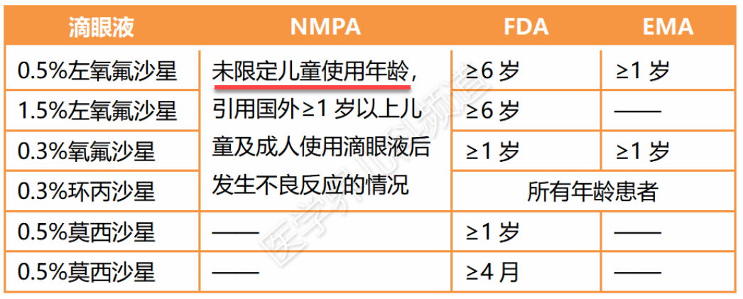 从表中我们可以看出大多喹诺酮类滴眼液儿科应用的年龄分水岭在1岁。