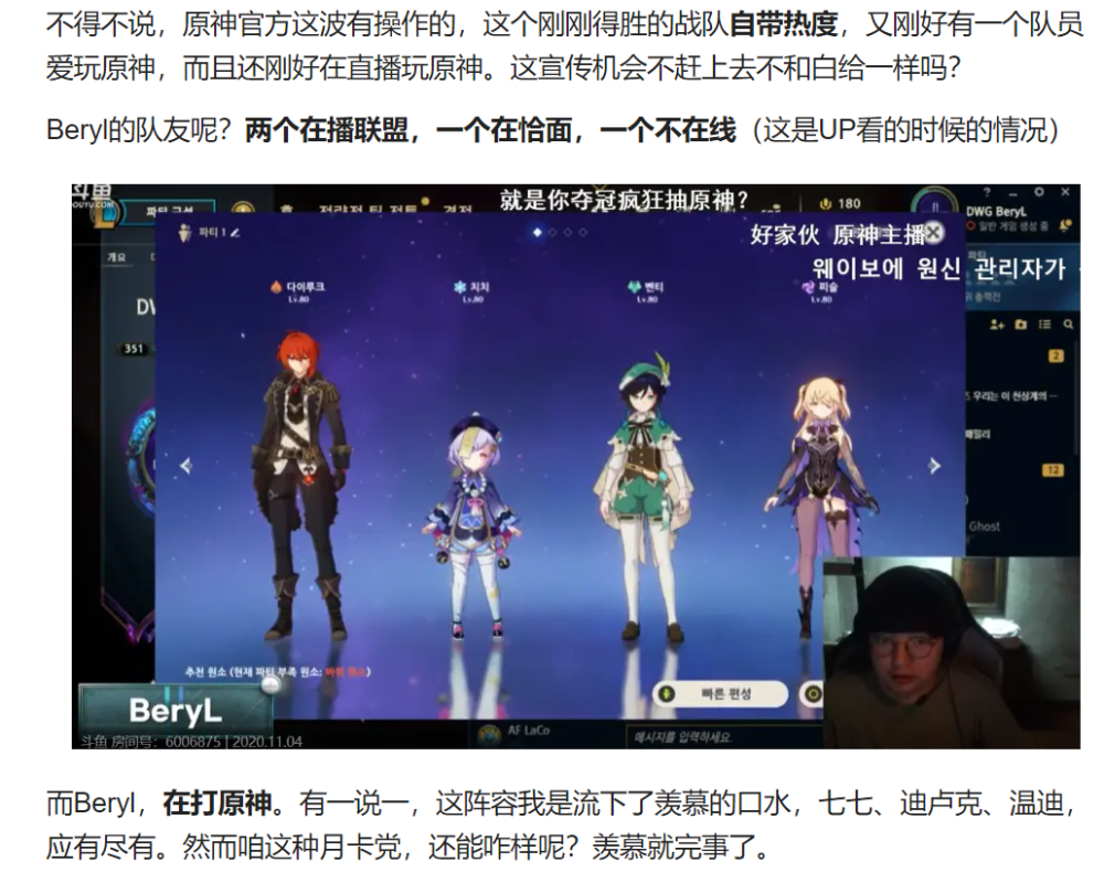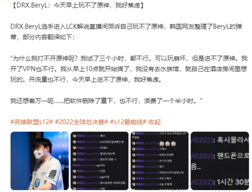 可见,Beryl和原神的“孽缘”并不是刚刚才开始的,他是个老玩家。而且是真爱玩原神,之前夺冠直播打原神,今年玩不了原神也直呼焦虑,比赛时也明显在把对面当教令院打。(doge)