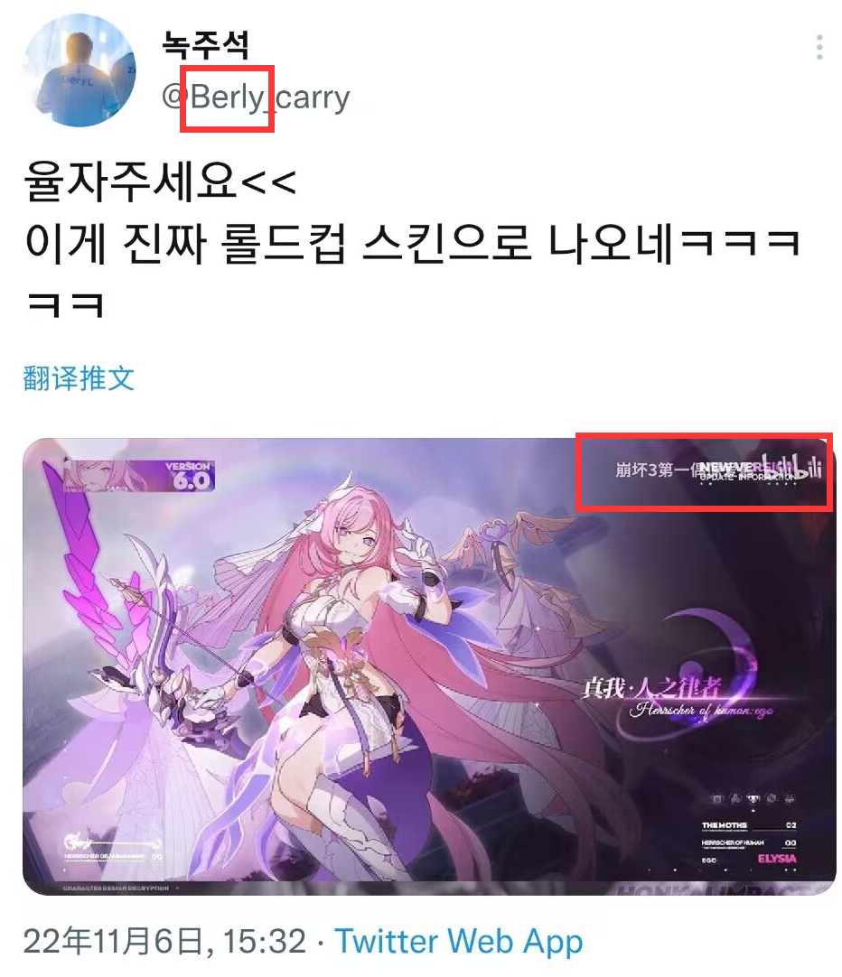 其一,选手名打错,应该是故意钓鱼的。其二,这是中文水印,这不合理,崩崩崩韩服应该也是有宣发账号的。