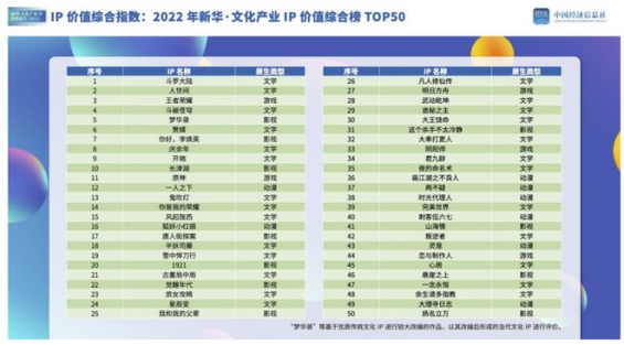 《王者荣耀》《原神》等入选2022文化产业IP价值综合榜TOP50