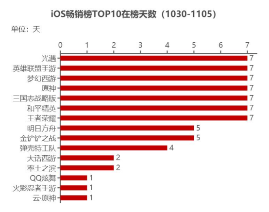 本周(1030-1105)共计15款产品登上过iOS畅销榜TOP10,其中《王者荣耀》、《和平精英》、《英雄联盟手游》、《原神》、《梦幻西游》、《三国志·战略版》、《光·遇》7款产品达成在榜7天成就。