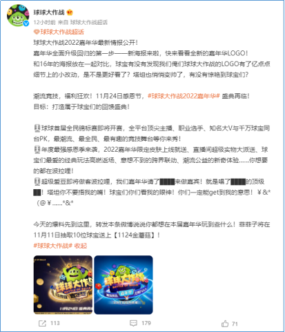 11月4日,巨人网络《球球大作战》官方发布微博称,产品将于11月24日开启“球球大作战2022嘉年华”,嘉年华内容包括球球首届全民锦标赛等内容,并伴有限定皮肤、玩法返场、跨界联动等游戏动态。
