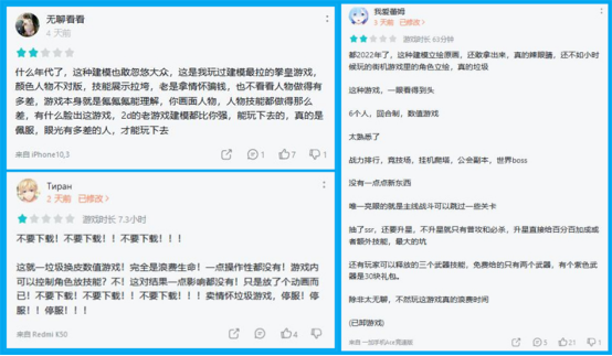 但也是因为SNK的情怀滤镜,部分玩家虽然给出了好评,却仍然对《全明星激斗》的角色建模、玩法存有意见,尤其是角色建模和玩法方面,是玩家负面评价的集中点。针对《全明星激斗》的评论中,大量玩家对立绘、建模表示了不满,并质疑《全明星激斗》与同类卡牌游戏高度相似。仅从建模与玩法两点来看,《全明星激斗》还有很大的改进空间。