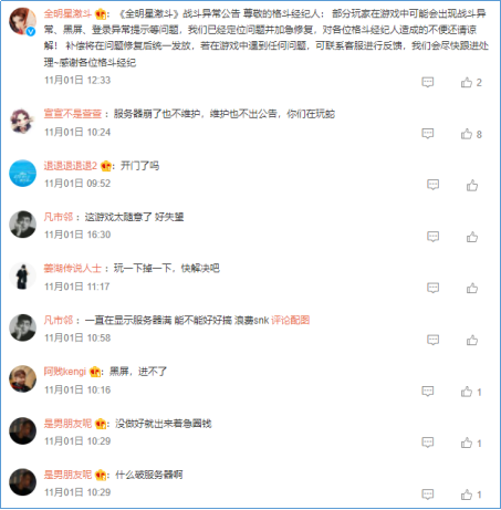 用户反馈层面,在公测首日部分玩家反馈产品出现了服务器崩溃、游戏内掉线等现象。在《全明星激斗》开服的官博下方评论区,玩家表示对产品开服当日出现此类问题的不满,认为产品“随意”、“浪费SNK”等。