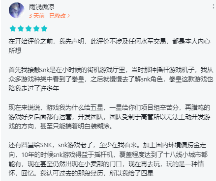 整体而言,玩家对《全明星激斗》的评价褒贬不一。正向评价主要针对产品的SNK IP,有玩家冲着SNK给自己带来的街机回忆、时光情怀而进入《全明星激斗》并给出好评。