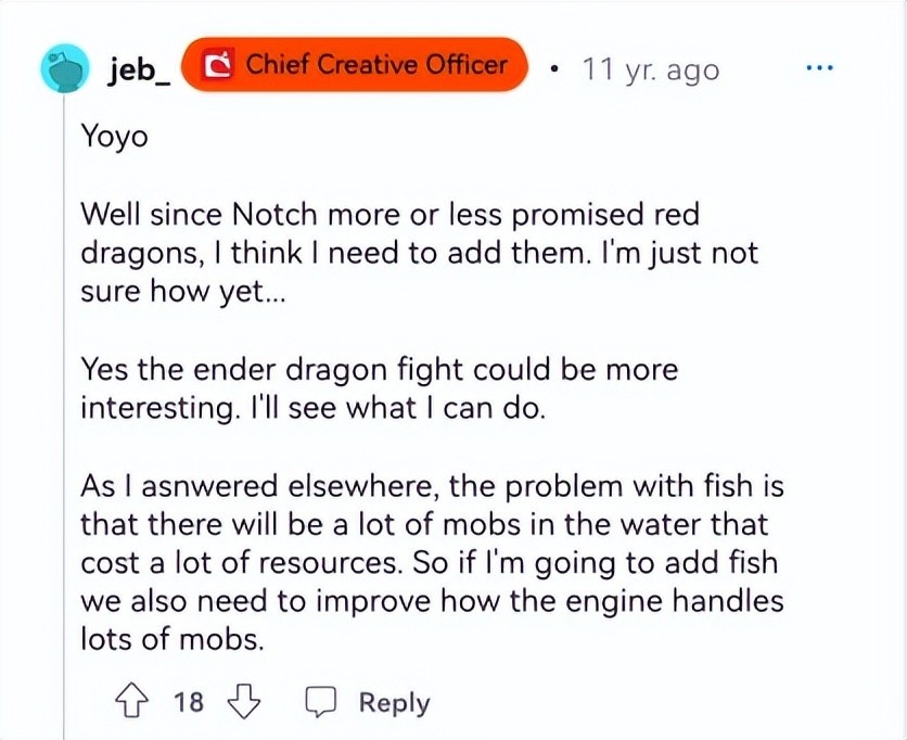 2011年12月,Jeb在社区中回复玩家关于红龙的问题。Jeb:好吧,既然我或多或少的对红龙的承诺,我想我需要添加它们。我只是不知道如何添加它们。