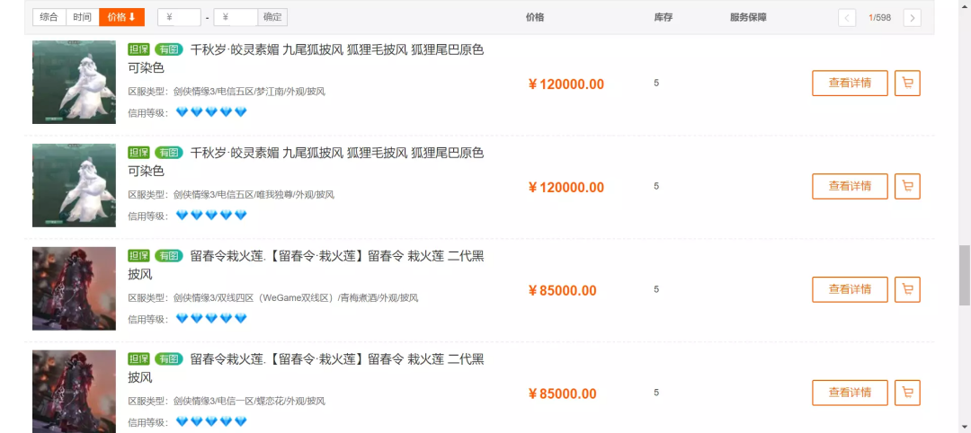 例如游戏在 2018 年推出的可染色披风“千秋岁 狡灵素媚”,因其通体雪白,形似狐狸尾巴,成为了女性玩家中非常热门的披风。价格也在绝版多年后,由 688 元的原价,飙升至第三方平台上令人咋舌的 12 万元。