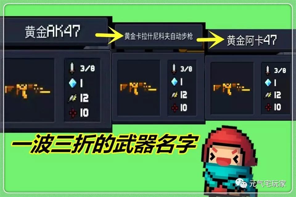 虽然《元气骑士》曾经只是一款小型单机手游,但是一旦人气火爆,它就不再是原来用来解闷的个人作品了,而是一款影响着整个手游领域的大作。所以对于游戏中许多不合理之处要学会整改,其中就有武器名称一项。